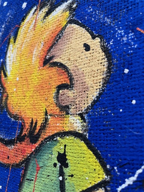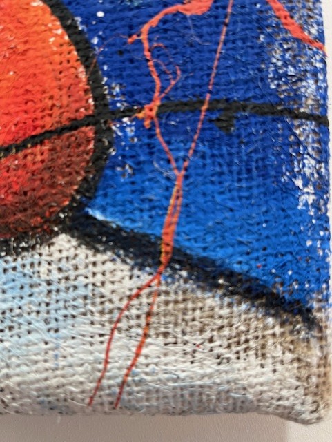 L’opera è realizzata completamente a mano intelaiando la tela di juta su un telaio di legno e creando il disegno dipingendolo con colori acrilici