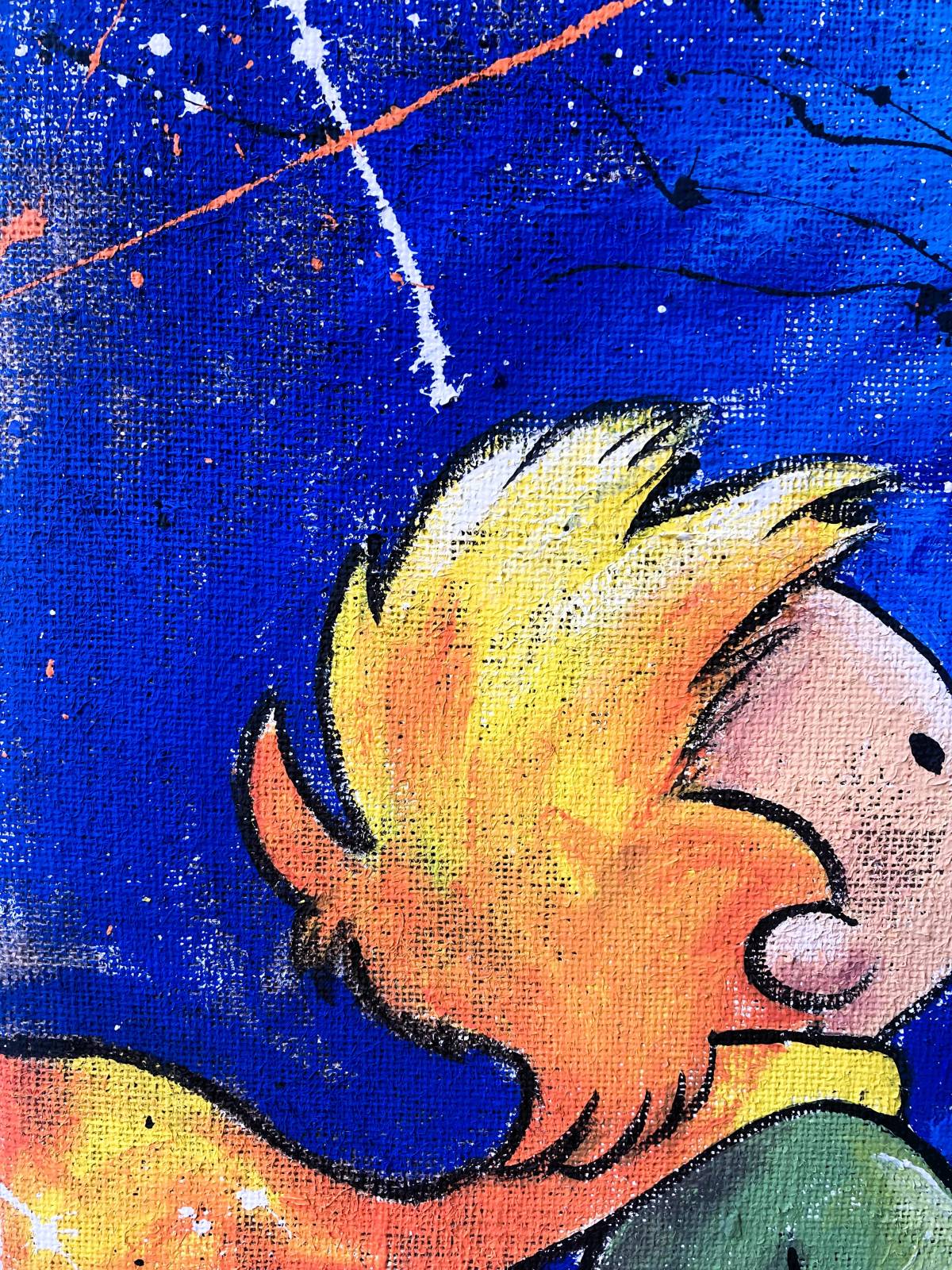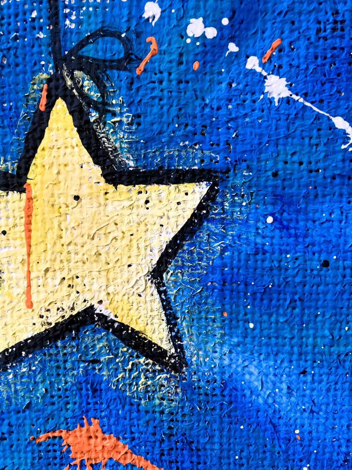 L’opera è realizzata completamente a mano intelaiando la tela di juta su un telaio di legno e creando il disegno dipingendolo con colori acrilici