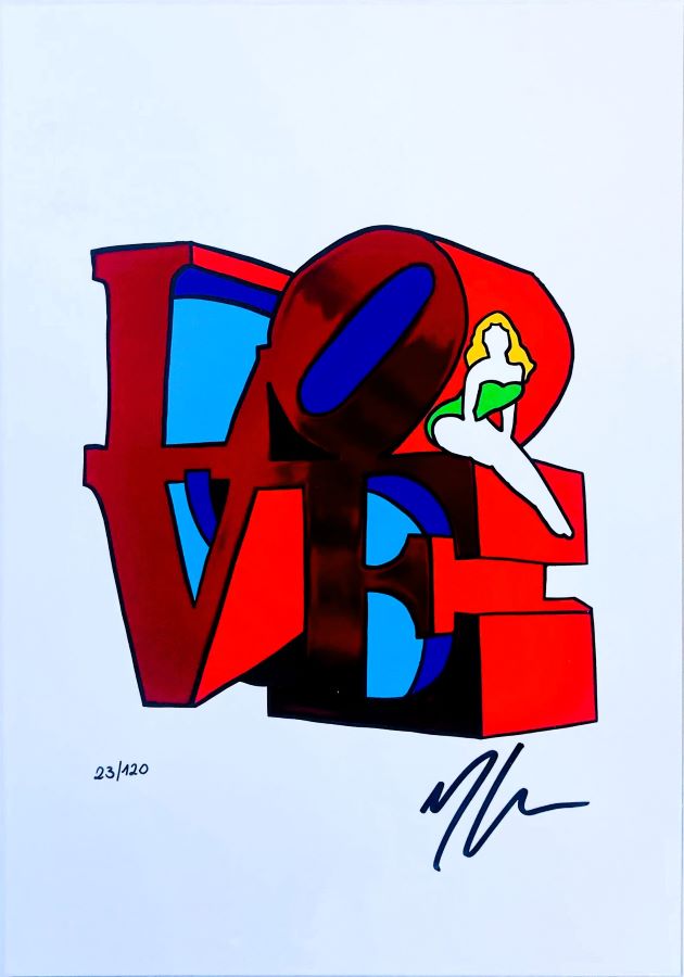 L’artista prende ispirazione dalla celebre opera “LOVE” di Robert Indiana, reinterpretandola con il suo stile e con l’aggiunta di inserti metalizzati crea uno strato di luminosità.